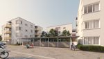Im Sinne einer wirtschaftlichen Lösung wurden zugunsten zusätzlicher Wohnungen im Erdgeschoß die erforderlichen Nebenräume der drei Wohnhäuser als gedeckter Müll- und Fahrradabstellplatz in den zentralen Wohnhof ausgelagert. Dieses Nebengebäude schließt nun längsparallel zur Fahrbahn und PKW-Abstellplätzen den Wohnhof. Der verbleibende Wohnhof wird von einem umlaufenden Fußweg, der die drei regengeschützten Wohnungszugänge zusammenfasst, begrenzt.
